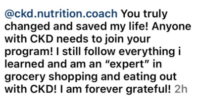 Disclaimer: The guidance provided in 1:1 coaching is for informational and educational purposes only and is not a substitute for medical advice, diagnosis, or treatment from a qualified healthcare provider. While my goal is to help you optimize your kidney health through personalized nutrition strategies, individual results may vary, and no specific outcomes can be guaranteed. Always consult your physician or healthcare team before making any significant dietary or lifestyle changes.